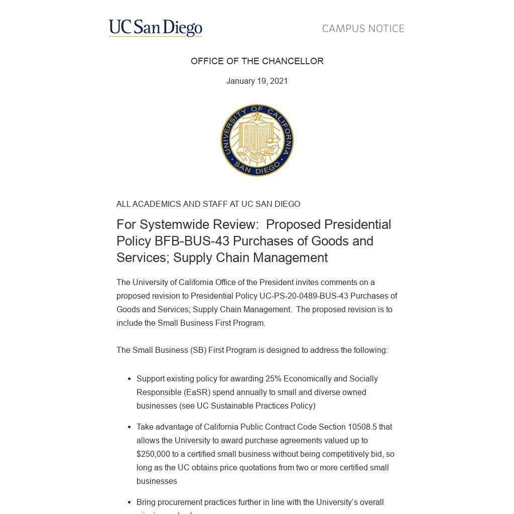 The University of California Office of the President invites comments on a proposed revision to Presidential Policy UC-PS-20-0489-BUS-43 Purchases of Goods and Services; Supply Chain Management. The proposed revision is to include the Small Business First Program.