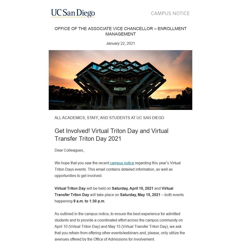 We hope that you saw the recent campus notice regarding this year’s Virtual Triton Days events. This email contains detailed information, as well as opportunities to get involved.
