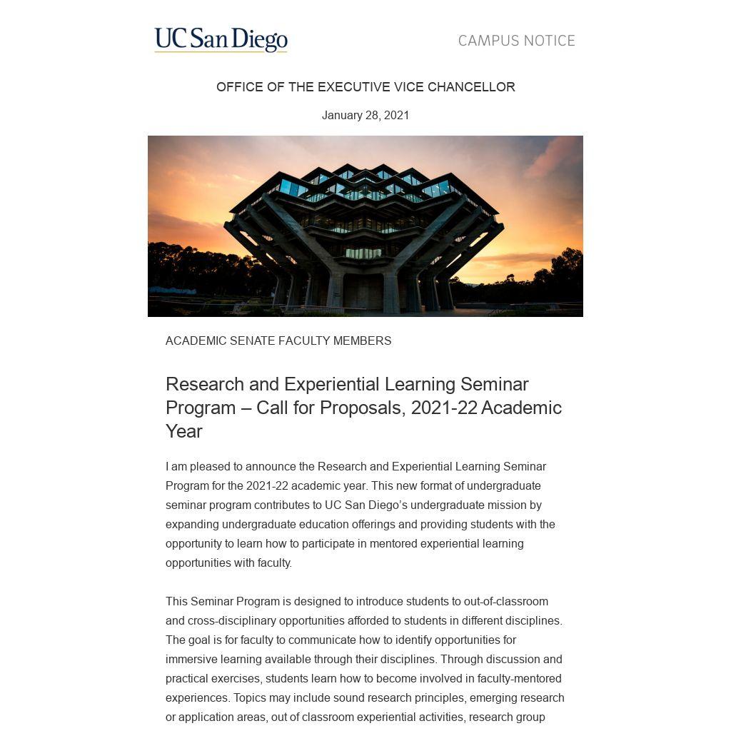 I am pleased to announce the Research and Experiential Learning Seminar Program for the 2021-22 academic year. This new format of undergraduate seminar program contributes to UC San Diego’s undergraduate mission by expanding undergraduate education offerings and providing students with the opportunity to learn how to participate in mentored experiential learning opportunities with faculty.