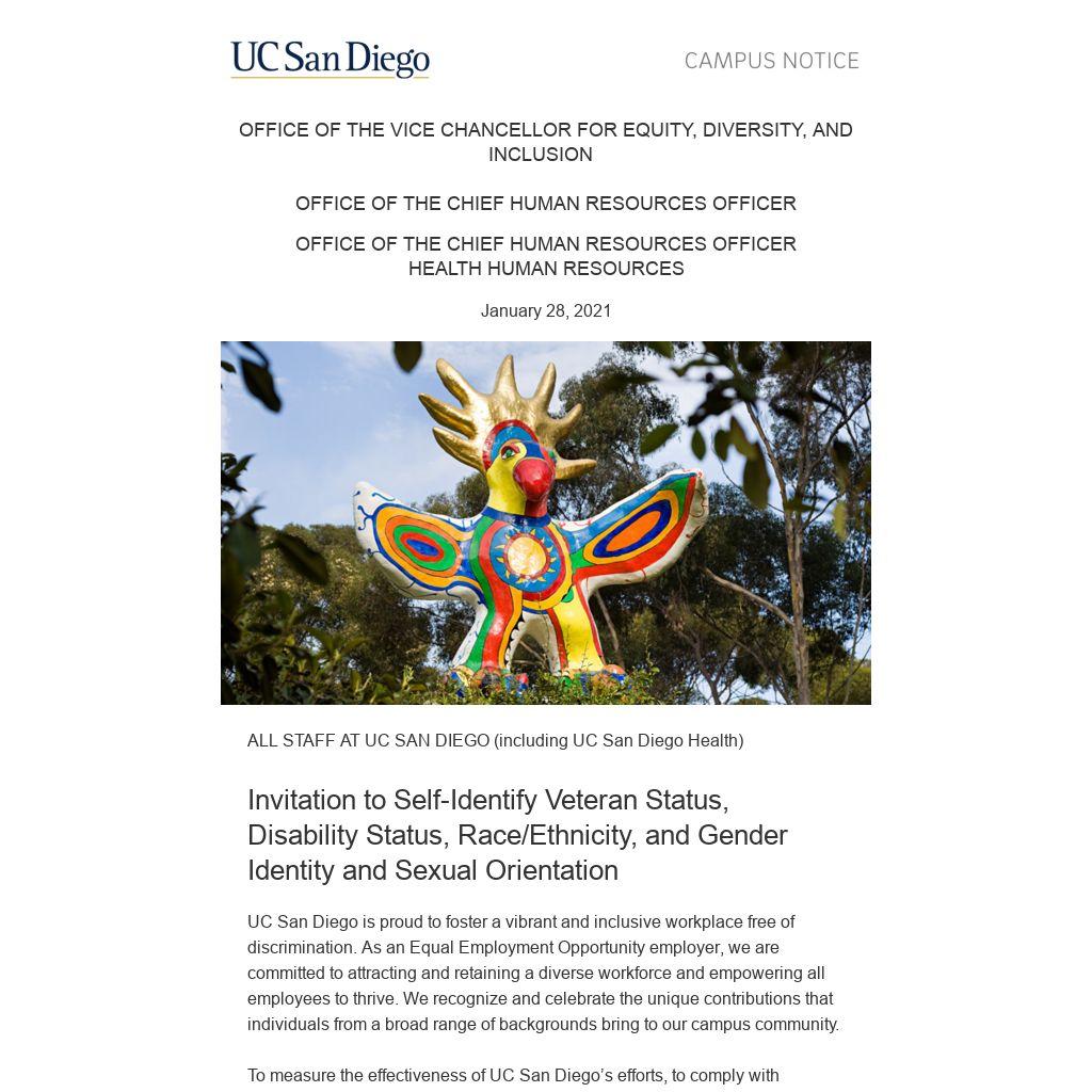 To measure the effectiveness of UC San Diego’s efforts, to comply with requirements as a federal contractor, and to have the most accurate data about our diverse employee community, we would like to encourage you to self-identify your veteran status, disability status, race/ethnicity, and gender identity and sexual orientation.