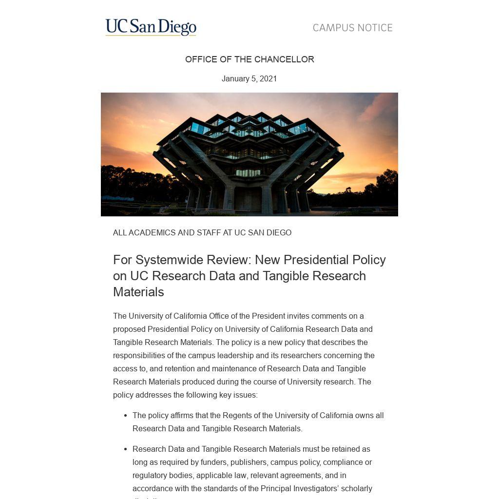 The University of California Office of the President invites comments on a proposed Presidential Policy on University of California Research Data and Tangible Research Materials. The policy is a new policy that describes the responsibilities of the campus leadership and its researchers concerning the access to, and retention and maintenance of Research Data and Tangible Research Materials produced during the course of University research. The policy addresses the following key issues: