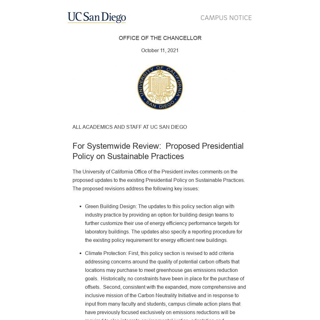 For Systemwide Review: Proposed Presidential Policy on Sustainable Practices