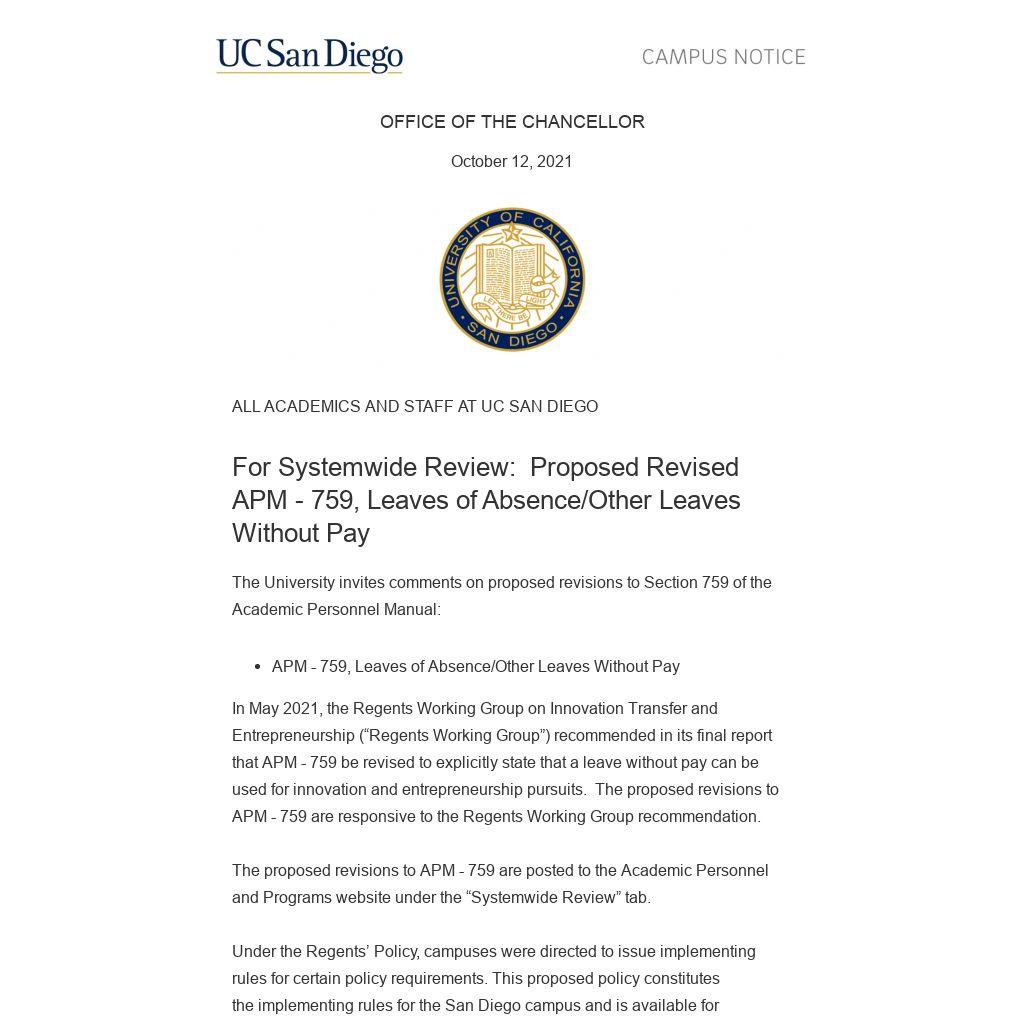 The University invites comments on proposed revisions to Section 759 of the Academic Personnel Manual: