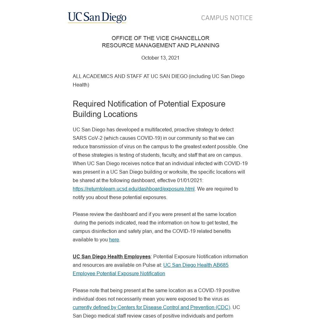 UC San Diego has developed a multifaceted, proactive strategy to detect SARS CoV-2 (which causes COVID-19) in our community so that we can reduce transmission of virus on the campus to the greatest extent possible. One of these strategies is testing of students, faculty, and staff that are on campus. When UC San Diego receives notice that an individual infected with COVID‐19 was present in a UC San Diego building or worksite, the specific locations will be shared at the following dashboard, effective 01/01/2021: https://returntolearn.ucsd.edu/dashboard/exposure.html. We are required to notify you about these potential exposures.