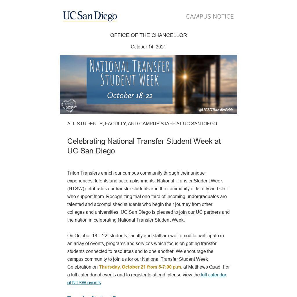 I wish to thank the UC San Diego community for your continued support in advancing the success of our transfer students. To learn more about National Transfer Student Week and transfer support on campus, please visit Transfer Student Success.