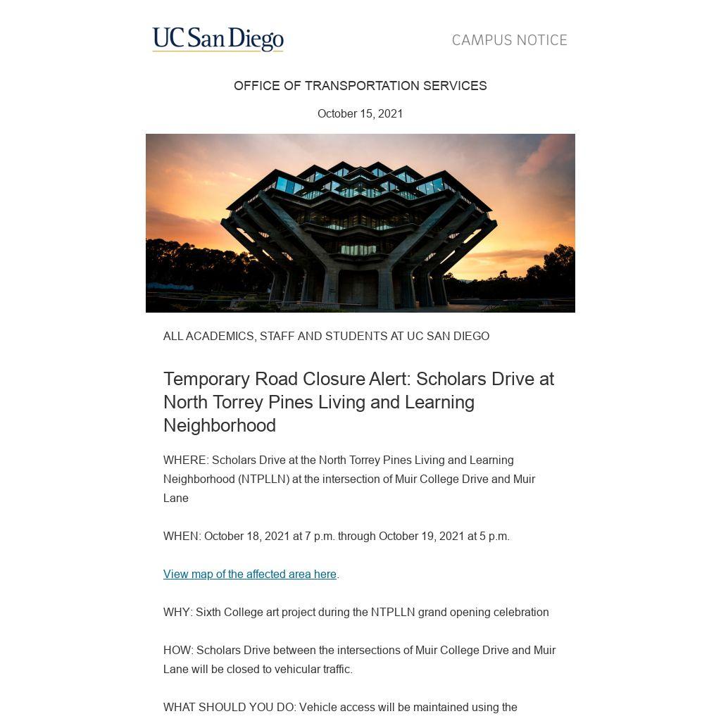 HOW: Scholars Drive between the intersections of Muir College Drive and Muir Lane will be closed to vehicular traffic.