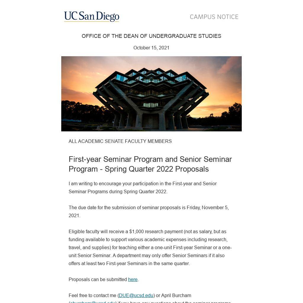 I am writing to encourage your participation in the First-year and Senior Seminar Programs during Spring Quarter 2022.