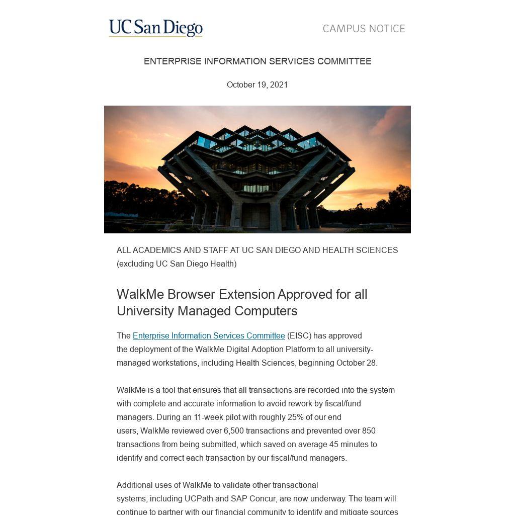To learn more about WalkMe features, the planned deployment, frequently asked questions and how to get help, visit walkme.ucsd.edu. Please send any general questions about this announcement to walkme@ucsd.edu.