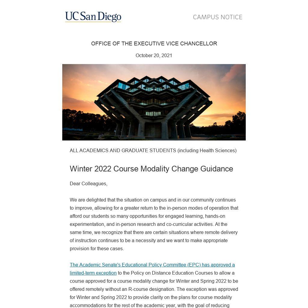 The Academic Senate's Educational Policy Committee (EPC) has approved a limited-term exception to the Policy on Distance Education Courses to allow a course approved for a course modality change for Winter and Spring 2022 to be offered remotely without an R-course designation. The exception was approved for Winter and Spring 2022 to provide clarity on the plans for course modality accommodations for the rest of the academic year, with the goal of reducing uncertainty about the process and acknowledging the need for continued flexibility and responsiveness should pandemic conditions change.