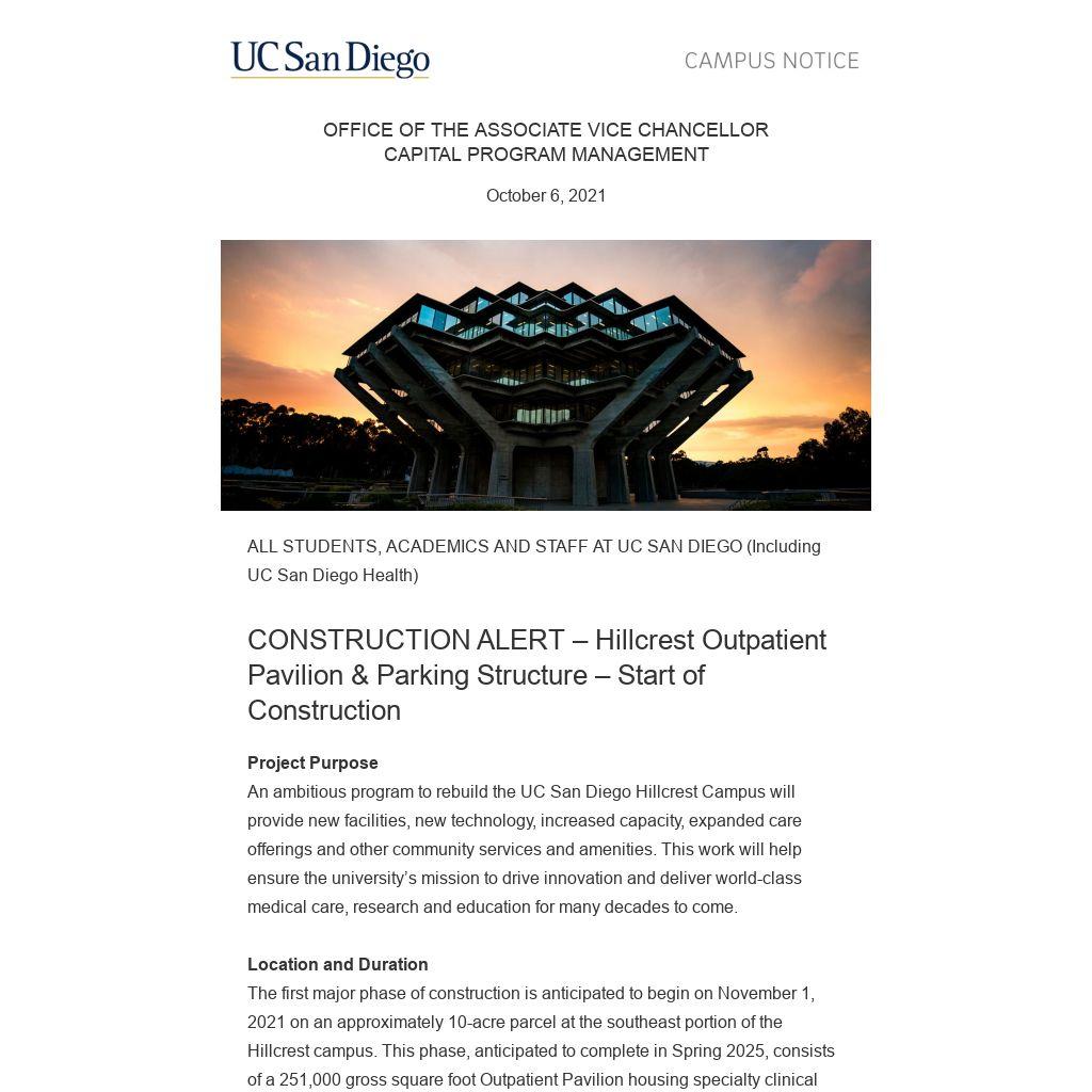 Location and Duration The first major phase of construction is anticipated to begin on November 1, 2021 on an approximately 10-acre parcel at the southeast portion of the Hillcrest campus. This phase, anticipated to complete in Spring 2025, consists of a 251,000 gross square foot Outpatient Pavilion housing specialty clinical programs, a new parking structure with approximately 1,850 parking spaces (consolidating patient and employee parking for improved patient and caregiver access) and related utility infrastructure. The redevelopment is part of the overall 2019 Hillcrest Long Range Development Plan that guides redevelopment of the Hillcrest Campus and construction of a new replacement hospital per the California Health and Safety Code (Alquist Act/SB 1953).