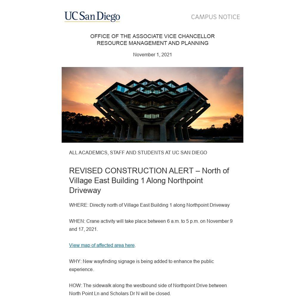 REVISED CONSTRUCTION ALERT – North of Village East Building 1 Along Northpoint Driveway