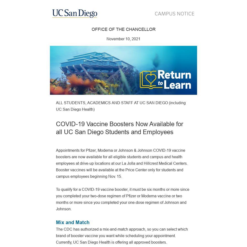 Appointments for Pfizer, Moderna or Johnson & Johnson COVID-19 vaccine boosters are now available for all eligible students and campus and health employees at drive-up locations at our La Jolla and Hillcrest Medical Centers. Booster vaccines will be available at the Price Center only for students and campus employees beginning Nov. 15.