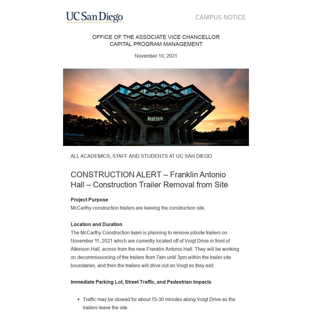 CONSTRUCTION ALERT – Franklin Antonio Hall – Construction Trailer Removal from Site