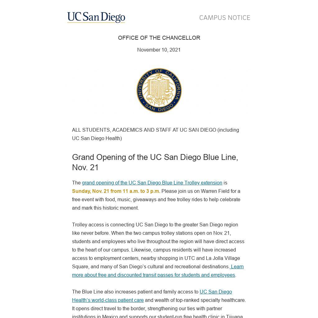 The grand opening of the UC San Diego Blue Line Trolley extension is Sunday, Nov. 21 from 11 a.m. to 3 p.m. Please join us on Warren Field for a free event with food, music, giveaways and free trolley rides to help celebrate and mark this historic moment.