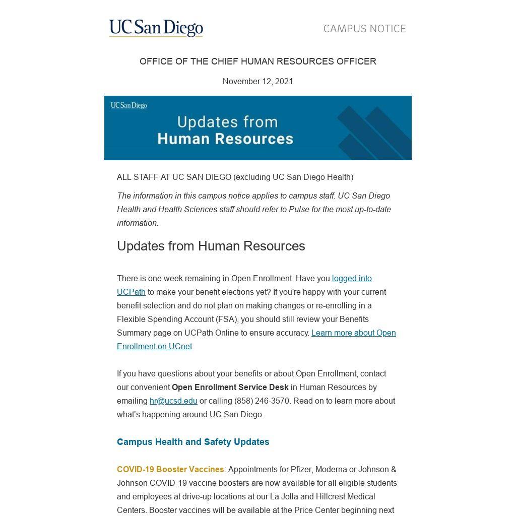 The information in this campus notice applies to campus staff. UC San Diego Health and Health Sciences staff should refer to Pulse for the most up-to-date information.