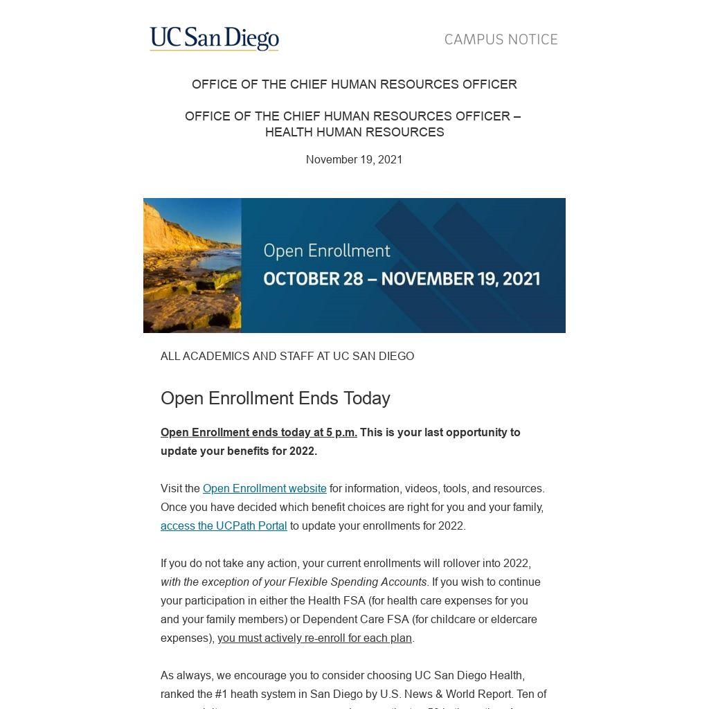 Visit the Open Enrollment website for information, videos, tools, and resources. Once you have decided which benefit choices are right for you and your family, access the UCPath Portal to update your enrollments for 2022.