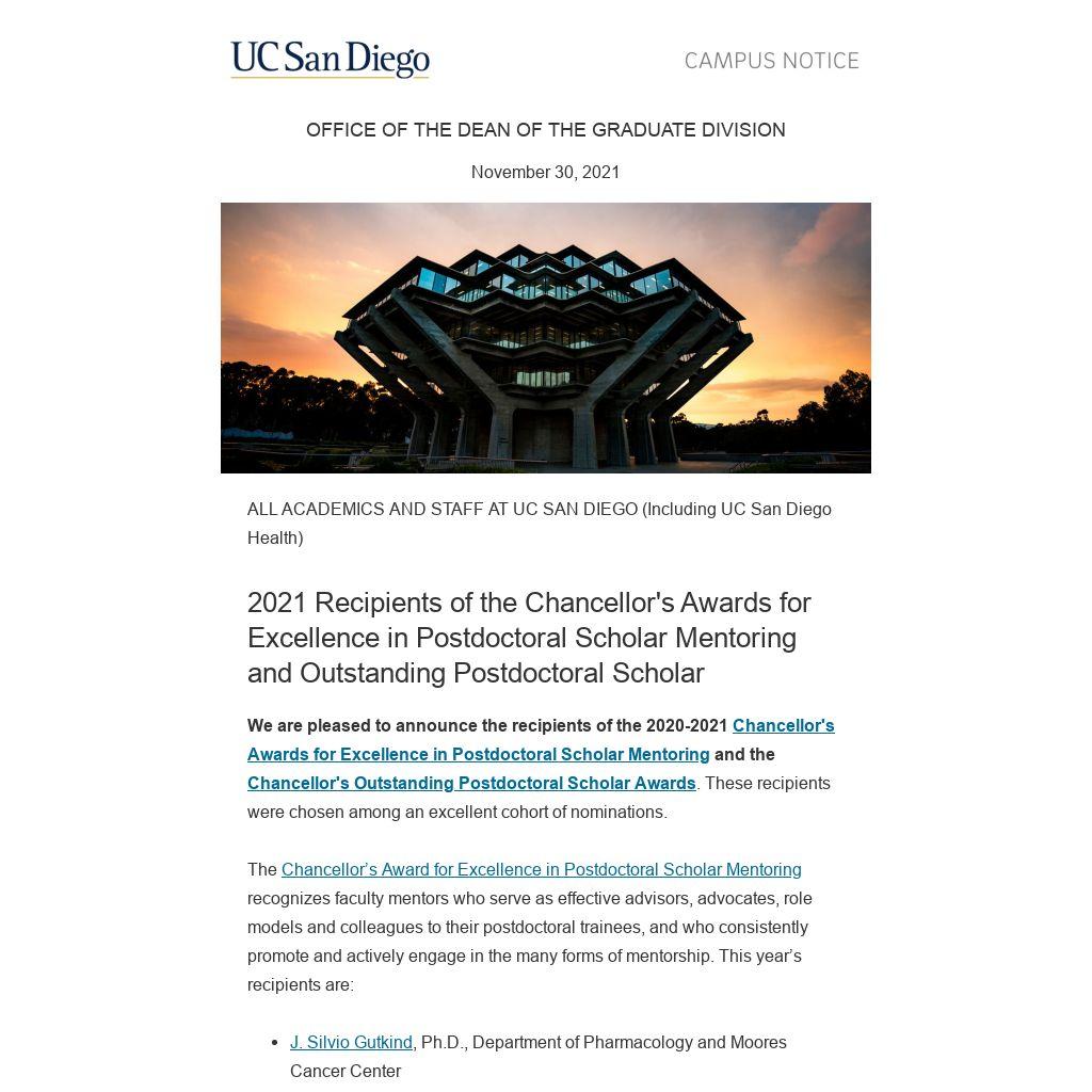 The Chancellor’s Outstanding Postdoctoral Scholar Award recognizes the well-rounded postdoctoral scholar who not only excels in research and advances the frontiers of science, but also provides leadership, mentorship, and service. This year’s recipients are: