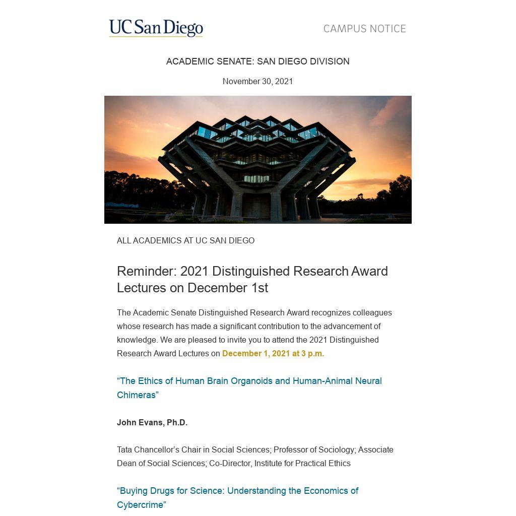 The Academic Senate Distinguished Research Award recognizes colleagues whose research has made a significant contribution to the advancement of knowledge. We are pleased to invite you to attend the 2021 Distinguished Research Award Lectures on December 1, 2021 at 3 p.m.