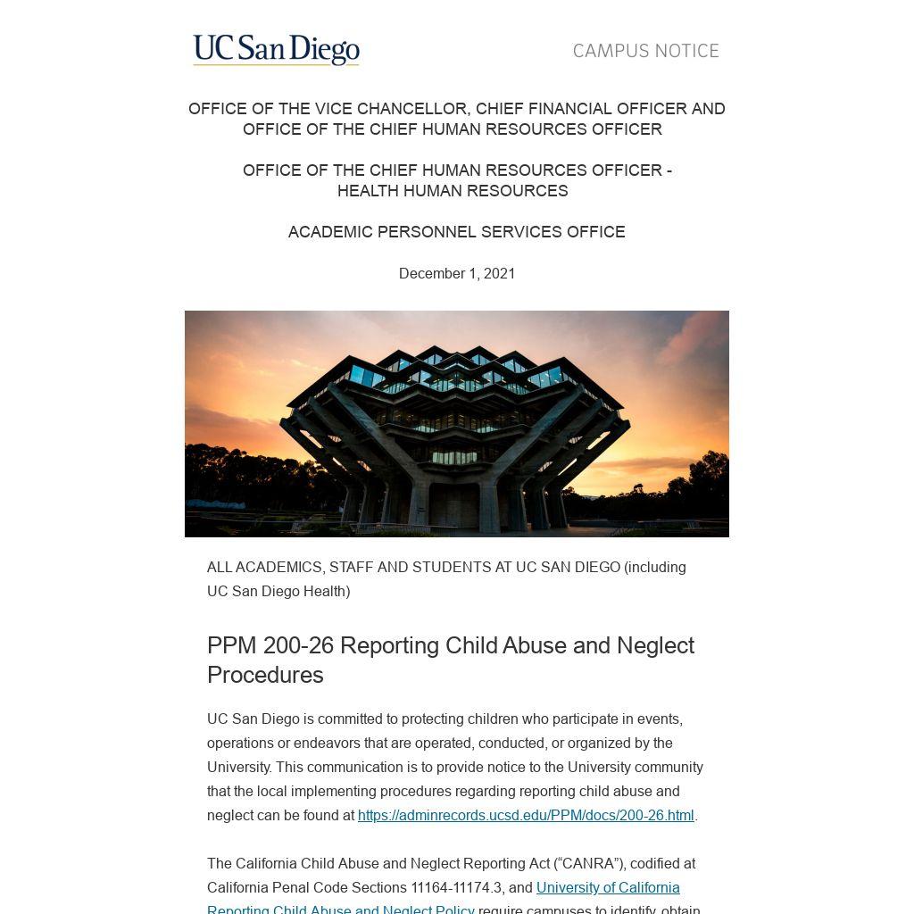 UC San Diego is committed to protecting children who participate in events, operations or endeavors that are operated, conducted, or organized by the University. This communication is to provide notice to the University community that the local implementing procedures regarding reporting child abuse and neglect can be found at https://adminrecords.ucsd.edu/PPM/docs/200-26.html.
