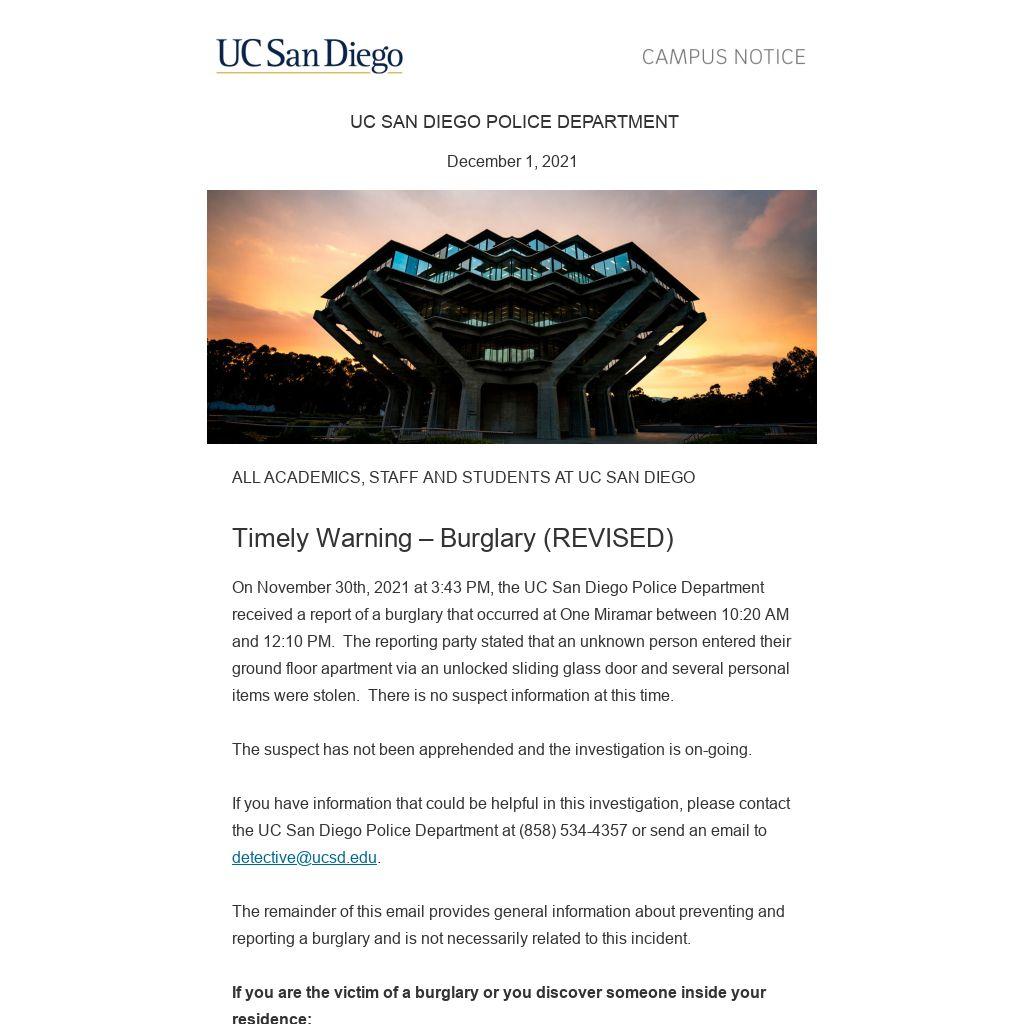 On November 30th, 2021 at 3:43 PM, the UC San Diego Police Department received a report of a burglary that occurred at One Miramar between 10:20 AM and 12:10 PM. The reporting party stated that an unknown person entered their ground floor apartment via an unlocked sliding glass door and several personal items were stolen. There is no suspect information at this time.