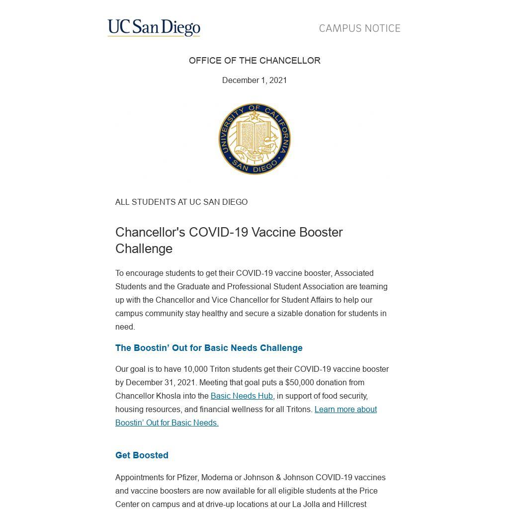 Our goal is to have 10,000 Triton students get their COVID-19 vaccine booster by December 31, 2021. Meeting that goal puts a $50,000 donation from Chancellor Khosla into the Basic Needs Hub, in support of food security, housing resources, and financial wellness for all Tritons. Learn more about Boostin’ Out for Basic Needs.