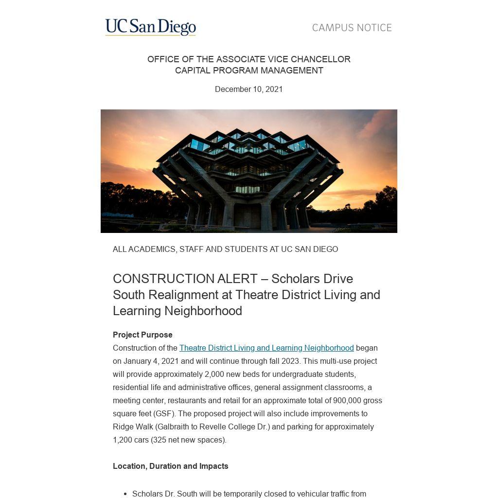 Scholars Dr. South will be temporarily closed to vehicular traffic from Keeling apartments to the intersection of Revelle College Dr. starting on December 20, 2021 and reopening spring quarter 2023.