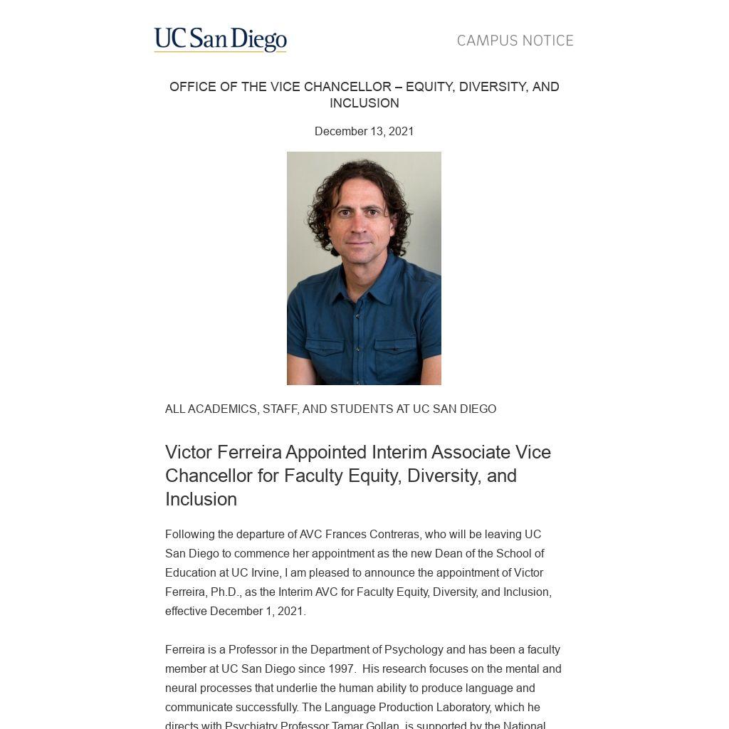 Following the departure of AVC Frances Contreras, who will be leaving UC San Diego to commence her appointment as the new Dean of the School of Education at UC Irvine, I am pleased to announce the appointment of Victor Ferreira, Ph.D., as the Interim AVC for Faculty Equity, Diversity, and Inclusion, effective December 1, 2021.