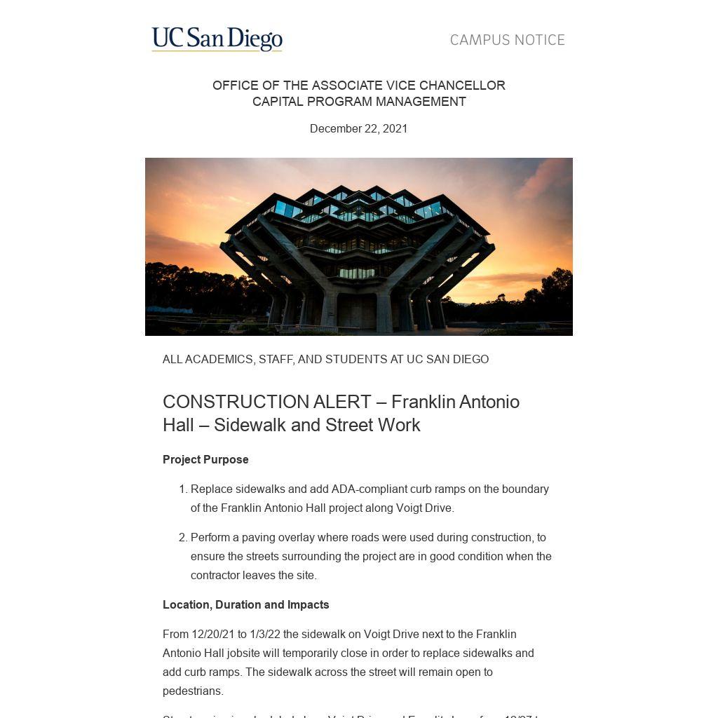 From 12/20/21 to 1/3/22 the sidewalk on Voigt Drive next to the Franklin Antonio Hall jobsite will temporarily close in order to replace sidewalks and add curb ramps. The sidewalk across the street will remain open to pedestrians.