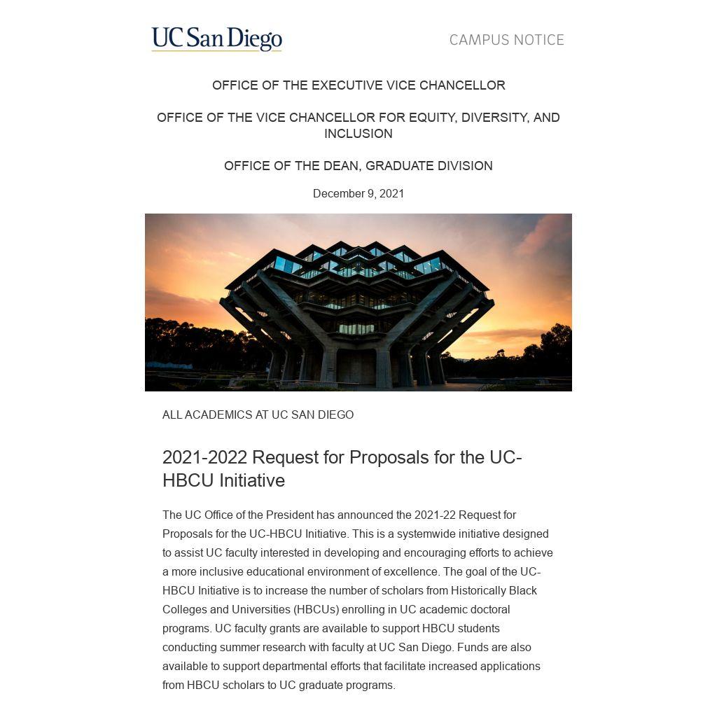 The UC Office of the President has announced the 2021-22 Request for Proposals for the UC-HBCU Initiative. This is a systemwide initiative designed to assist UC faculty interested in developing and encouraging efforts to achieve a more inclusive educational environment of excellence. The goal of the UC-HBCU Initiative is to increase the number of scholars from Historically Black Colleges and Universities (HBCUs) enrolling in UC academic doctoral programs. UC faculty grants are available to support HBCU students conducting summer research with faculty at UC San Diego. Funds are also available to support departmental efforts that facilitate increased applications from HBCU scholars to UC graduate programs.