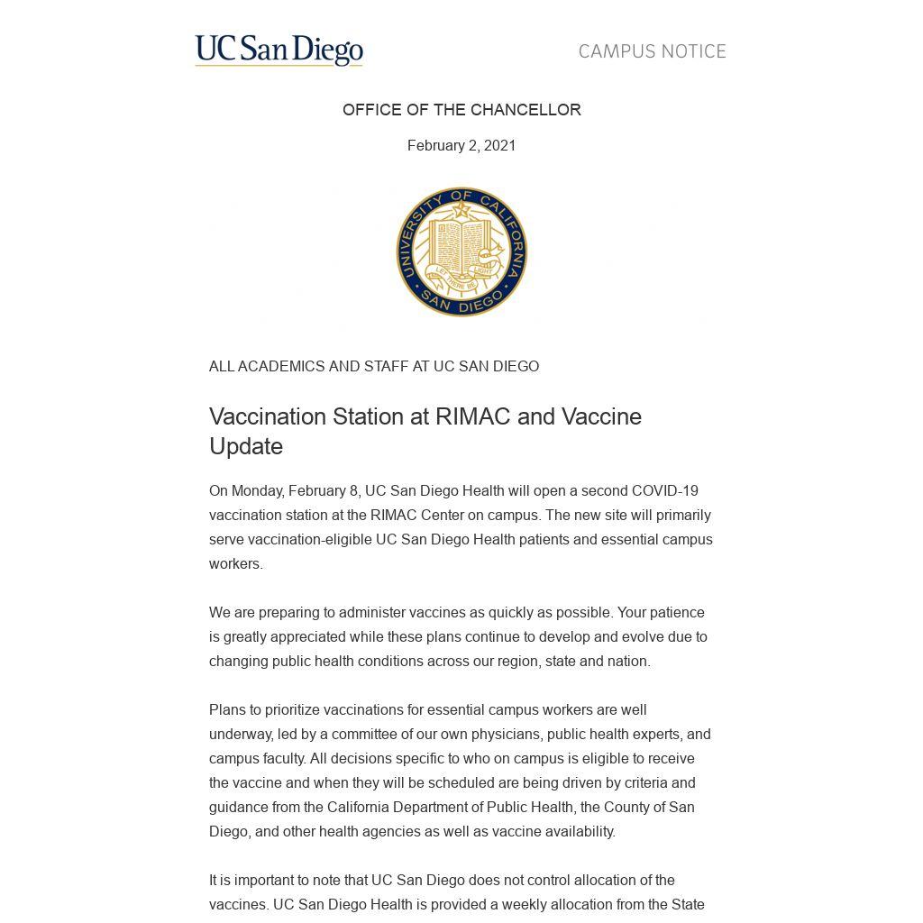 With the opening of the RIMAC vaccination site, UC San Diego Health is prepared to administer vaccines to our eligible essential campus workers in addition to patients when San Diego County permits it and we are provided sufficient allocation of vaccines.