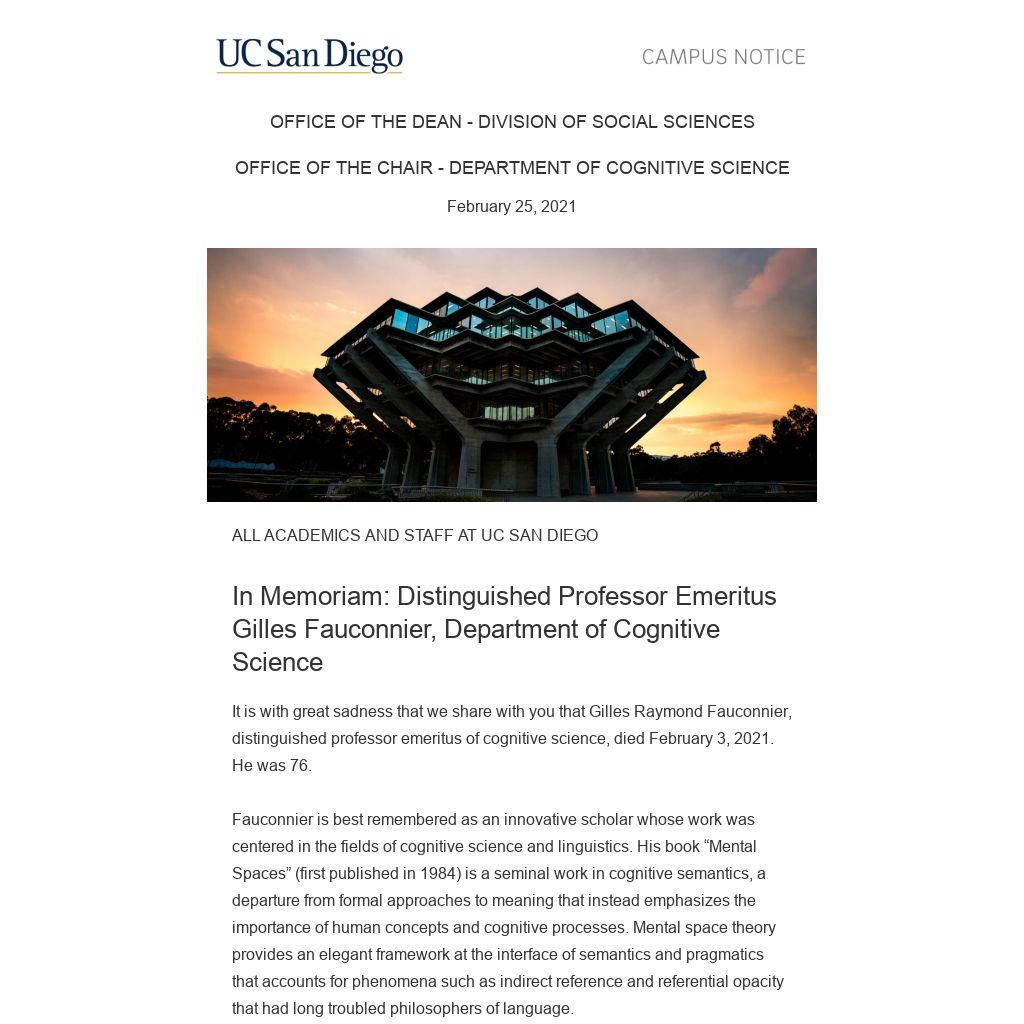It is with great sadness that we share with you that Gilles Raymond Fauconnier, distinguished professor emeritus of cognitive science, died February 3, 2021. He was 76.