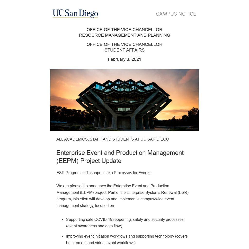 We are pleased to announce the Enterprise Event and Production Management (EEPM) project. Part of the Enterprise Systems Renewal (ESR) program, this effort will develop and implement a campus-wide event management strategy, focused on: