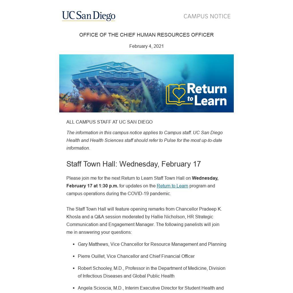 Please join me for the next Return to Learn Staff Town Hall on Wednesday, February 17 at 1:30 p.m. for updates on the Return to Learn program and campus operations during the COVID-19 pandemic.