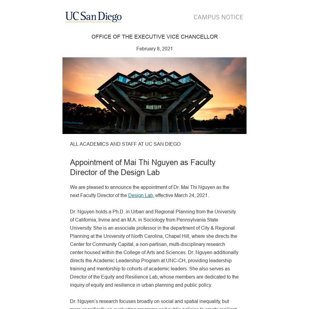 Dr. Nguyen is well positioned to lead the Design Lab, now in its 7th year, into its next chapter. As Faculty Director, Dr. Nguyen will convene and lead a diverse multi-disciplinary community to develop systems that can be trusted, used and appreciated, and to ultimately weave design into the fabric of academic, research and community life at UC San Diego. She will oversee and help grow a vigorous portfolio of high-quality, impactful and sustainable research and educational programming to engage communities beyond our university. Throughout her tenure at UNC-CH, she has engaged in and led cross-disciplinary, cross sector, and inter-institutional collaborations with the mindset that solving complex societal problems requires a multi-disciplinary, systems, and multi-scalar approach.