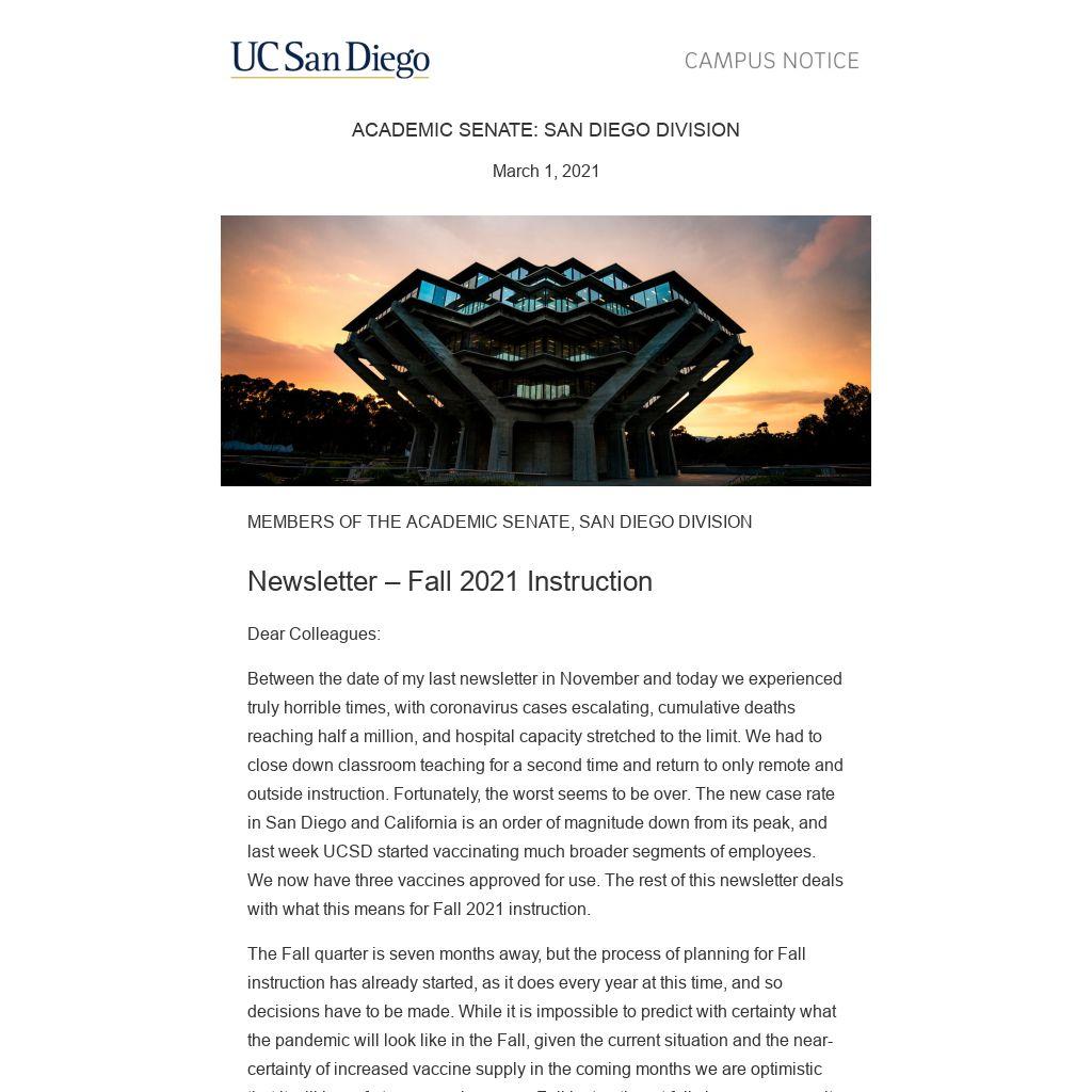 Between the date of my last newsletter in November and today we experienced truly horrible times, with coronavirus cases escalating, cumulative deaths reaching half a million, and hospital capacity stretched to the limit. We had to close down classroom teaching for a second time and return to only remote and outside instruction. Fortunately, the worst seems to be over. The new case rate in San Diego and California is an order of magnitude down from its peak, and last week UCSD started vaccinating much broader segments of employees. We now have three vaccines approved for use. The rest of this newsletter deals with what this means for Fall 2021 instruction.