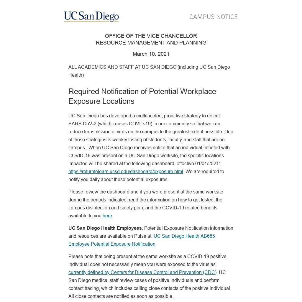UC San Diego has developed a multifaceted, proactive strategy to detect SARS CoV-2 (which causes COVID-19) in our community so that we can reduce transmission of virus on the campus to the greatest extent possible. One of these strategies is weekly testing of students, faculty, and staff that are on campus.  When UC San Diego receives notice that an individual infected with COVID‐19 was present on a UC San Diego worksite, the specific locations impacted will be shared at the following dashboard, effective 01/01/2021: https://returntolearn.ucsd.edu/dashboard/exposure.html. We are required to notify you daily about these potential exposures.