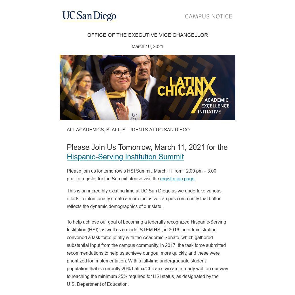 To facilitate the initiative’s success, through larger campus engagement and collective impact, we are hosting an HSI Summit on March 11, from 12:00 pm – 3:00 pm. The summit is open to the entire campus community. Join us and learn why becoming an HSI is so critical to UC San Diego, our region, and State; and how you can take action to deepen our student-centered mission and help UC San Diego be the university of choice for Latinx/Chicanx students. To register for the Summit please visit the registration page.