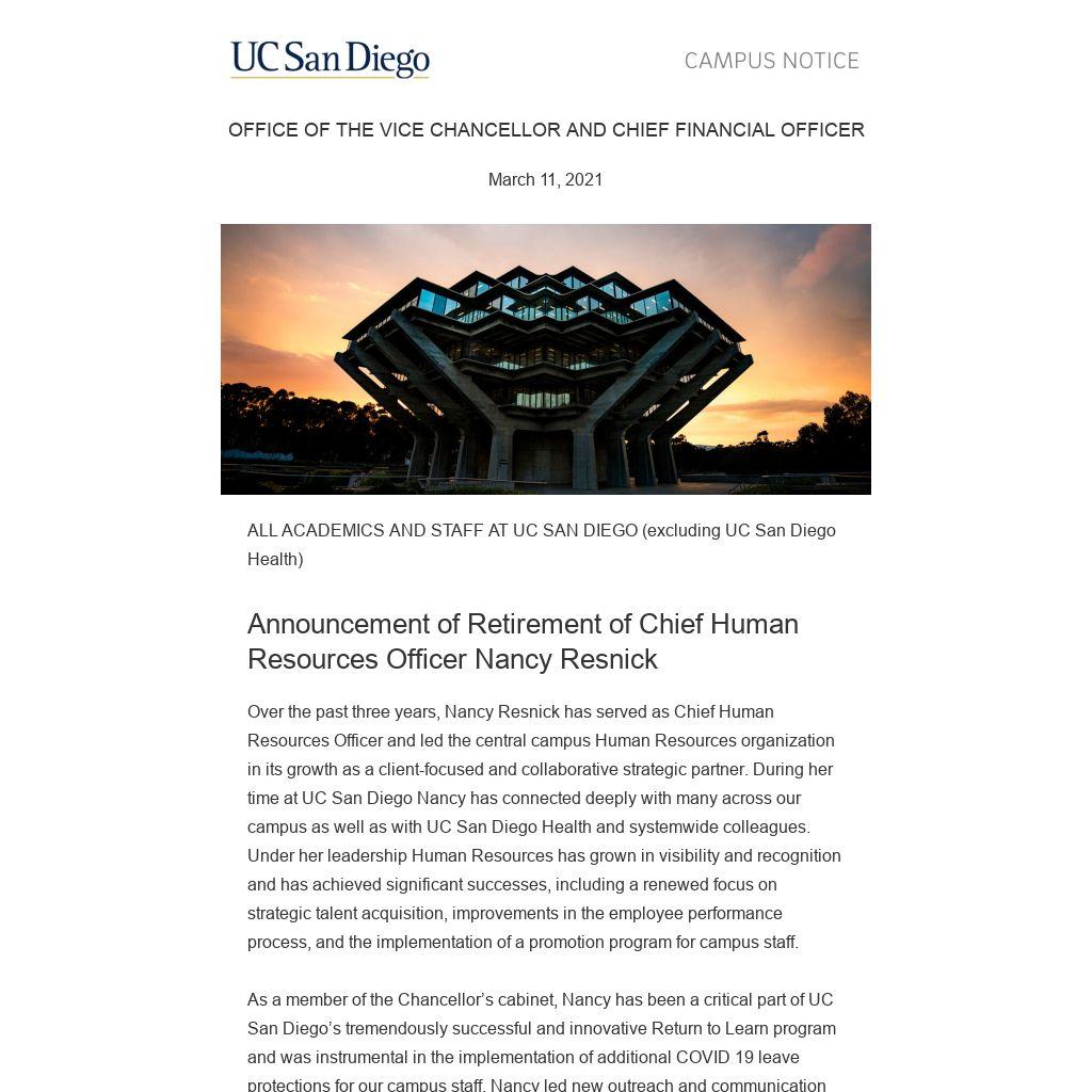 I will miss Nancy personally as a colleague and key member of my senior leadership team. Please join me in thanking Nancy for her service to UC San Diego, and in wishing her the very best in retirement.