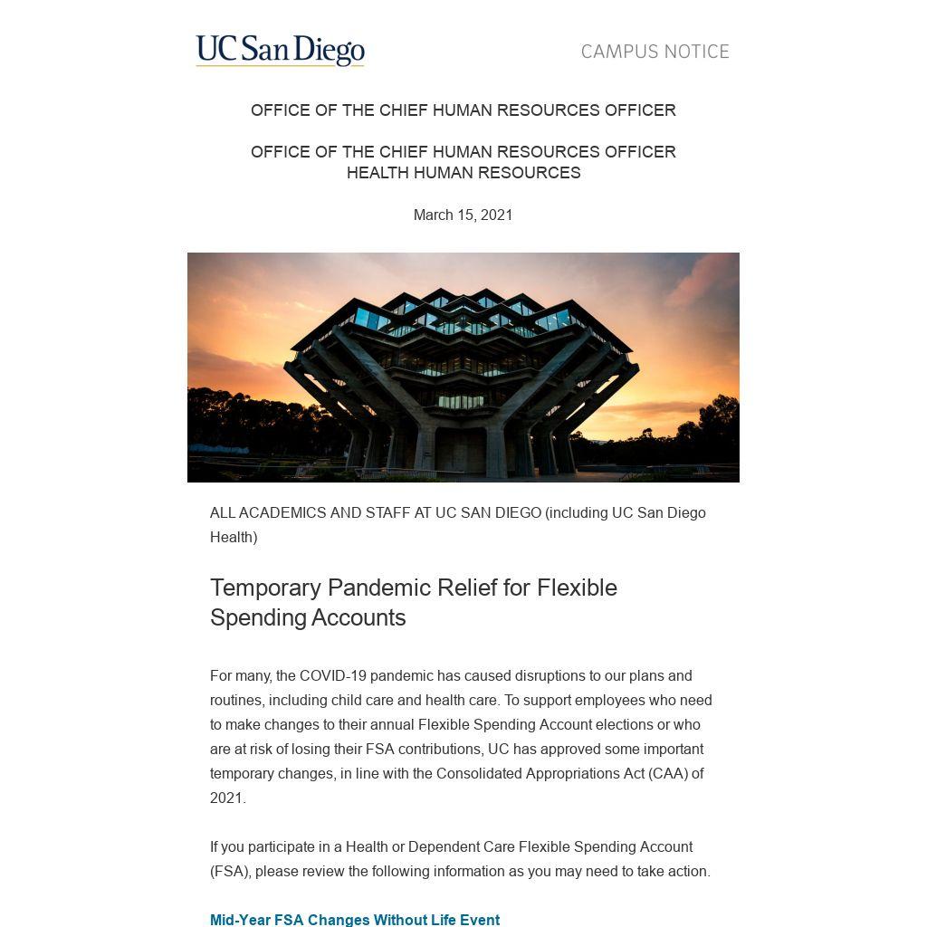Increase in Maximum Age of Eligible Dependents: The maximum age for eligible dependents under the Dependent Care FSA has been temporarily increased to age 14. In order to qualify for this relief, an employee must have been enrolled in Dependent Care FSA in 2020 and have a dependent child who turns 13 during 2020 or 2021.