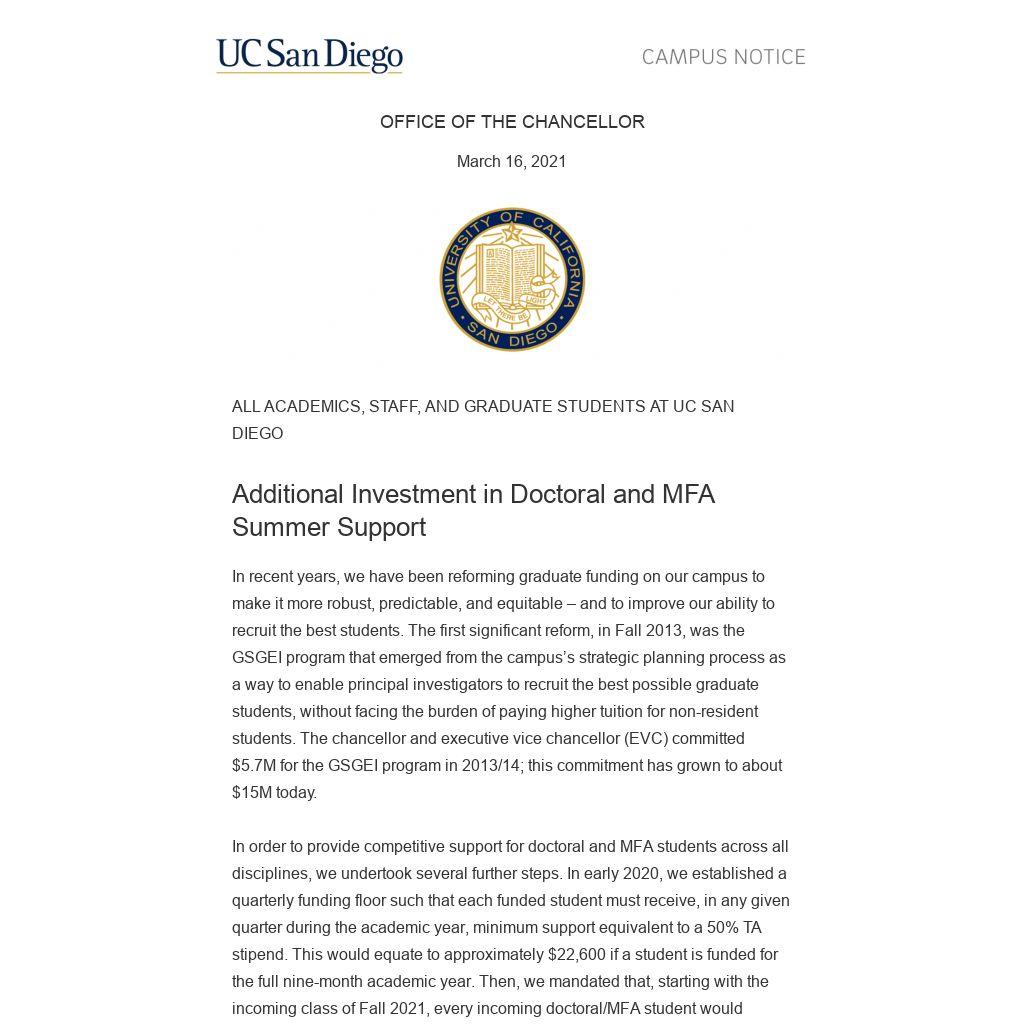 As we begin to emerge from the pandemic we are continuing to prioritize the reform of graduate funding. In order to provide a consistent source of graduate support for 12 months of the year, the chancellor and EVC are investing additional recurring resources to establish summer opportunities for doctoral/MFA students who do not already earn a salary or stipend of at least $30,000 per year (academic year plus summer) through some combination of UC San Diego funded and externally funded sources. This is focused on graduate programs where student support has historically been less than $30,000 over 12 months.
