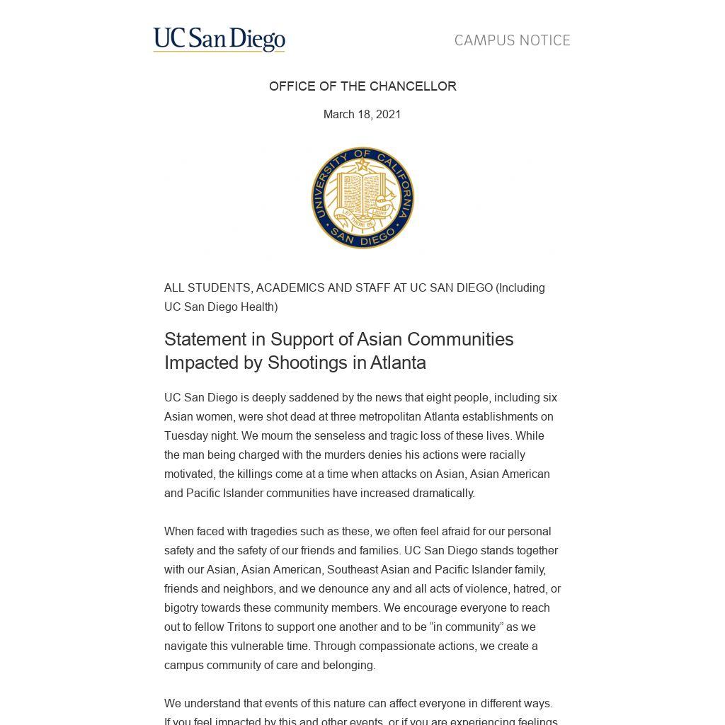 UC San Diego is deeply saddened by the news that eight people, including six Asian women, were shot dead at three metropolitan Atlanta establishments on Tuesday night. We mourn the senseless and tragic loss of these lives. While the man being charged with the murders denies his actions were racially motivated, the killings come at a time when attacks on Asian, Asian American and Pacific Islander communities have increased dramatically.