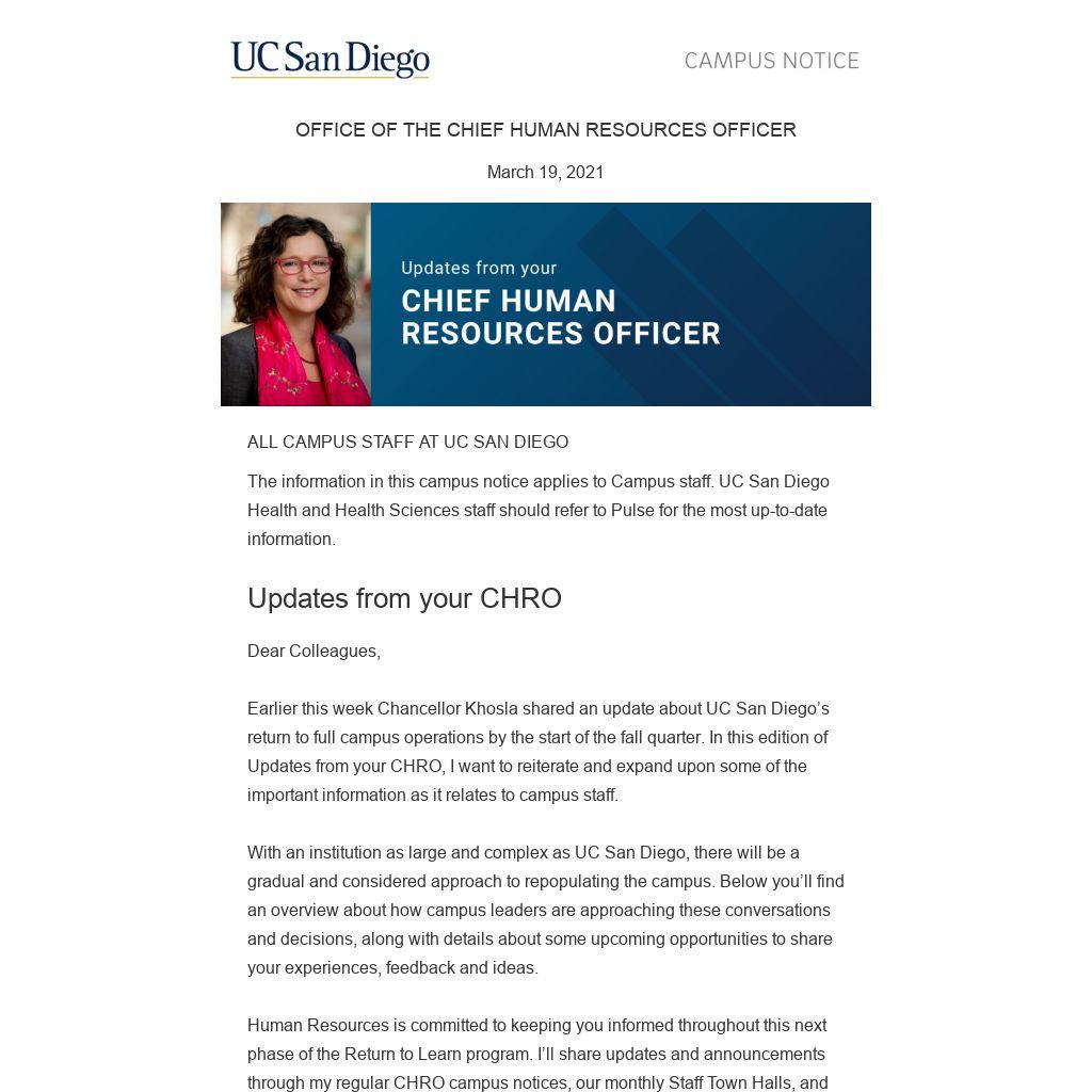 Earlier this week Chancellor Khosla shared an update about UC San Diego’s return to full campus operations by the start of the fall quarter. In this edition of Updates from your CHRO, I want to reiterate and expand upon some of the important information as it relates to campus staff.