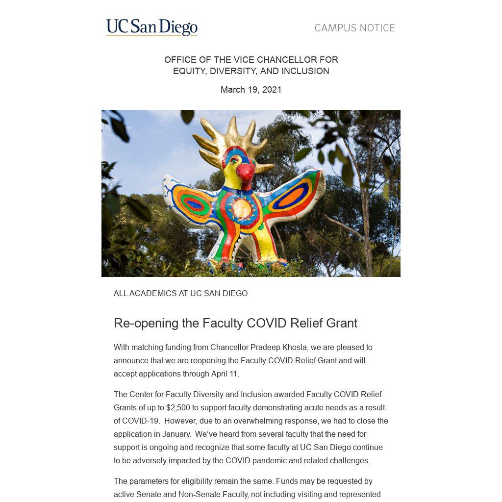 With matching funding from Chancellor Pradeep Khosla, we are pleased to announce that we are reopening the Faculty COVID Relief Grant and will accept applications through April 11.