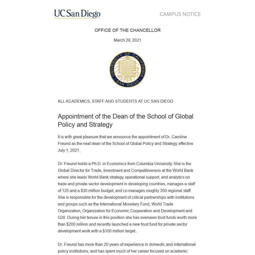 It is with great pleasure that we announce the appointment of Dr. Caroline Freund as the next dean of the School of Global Policy and Strategy, effective July 1, 2021.