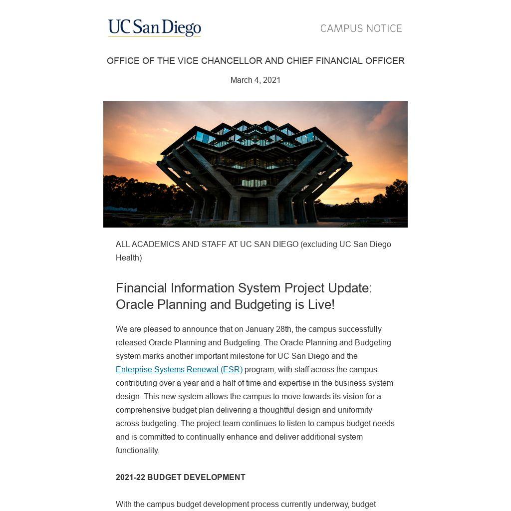 We are pleased to announce that on January 28th, the campus successfully released Oracle Planning and Budgeting. The Oracle Planning and Budgeting system marks another important milestone for UC San Diego and the Enterprise Systems Renewal (ESR) program, with staff across the campus contributing over a year and a half of time and expertise in the business system design. This new system allows the campus to move towards its vision for a comprehensive budget plan delivering a thoughtful design and uniformity across budgeting. The project team continues to listen to campus budget needs and is committed to continually enhance and deliver additional system functionality.