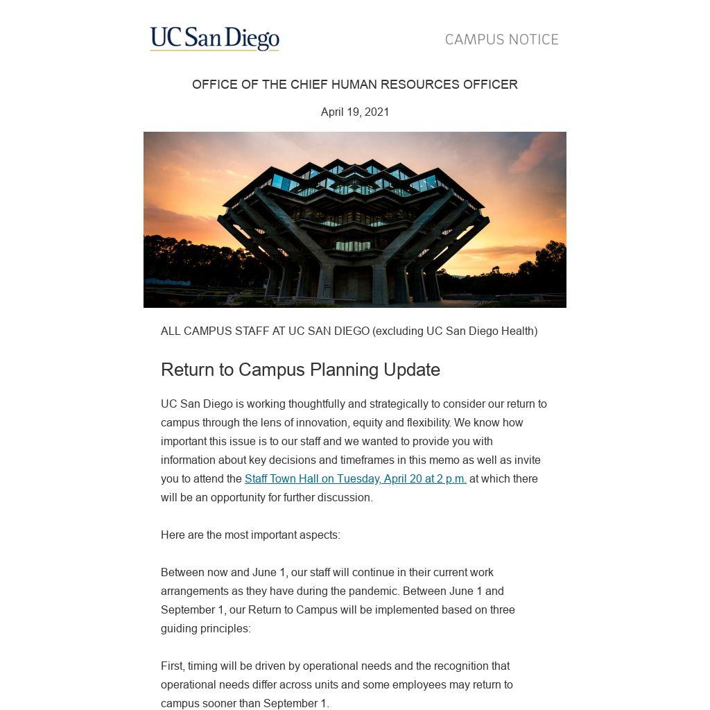 UC San Diego is working thoughtfully and strategically to consider our return to campus through the lens of innovation, equity and flexibility. We know how important this issue is to our staff and we wanted to provide you with information about key decisions and timeframes in this memo as well as invite you to attend the Staff Town Hall on Tuesday, April 20 at 2 p.m. at which there will be an opportunity for further discussion.