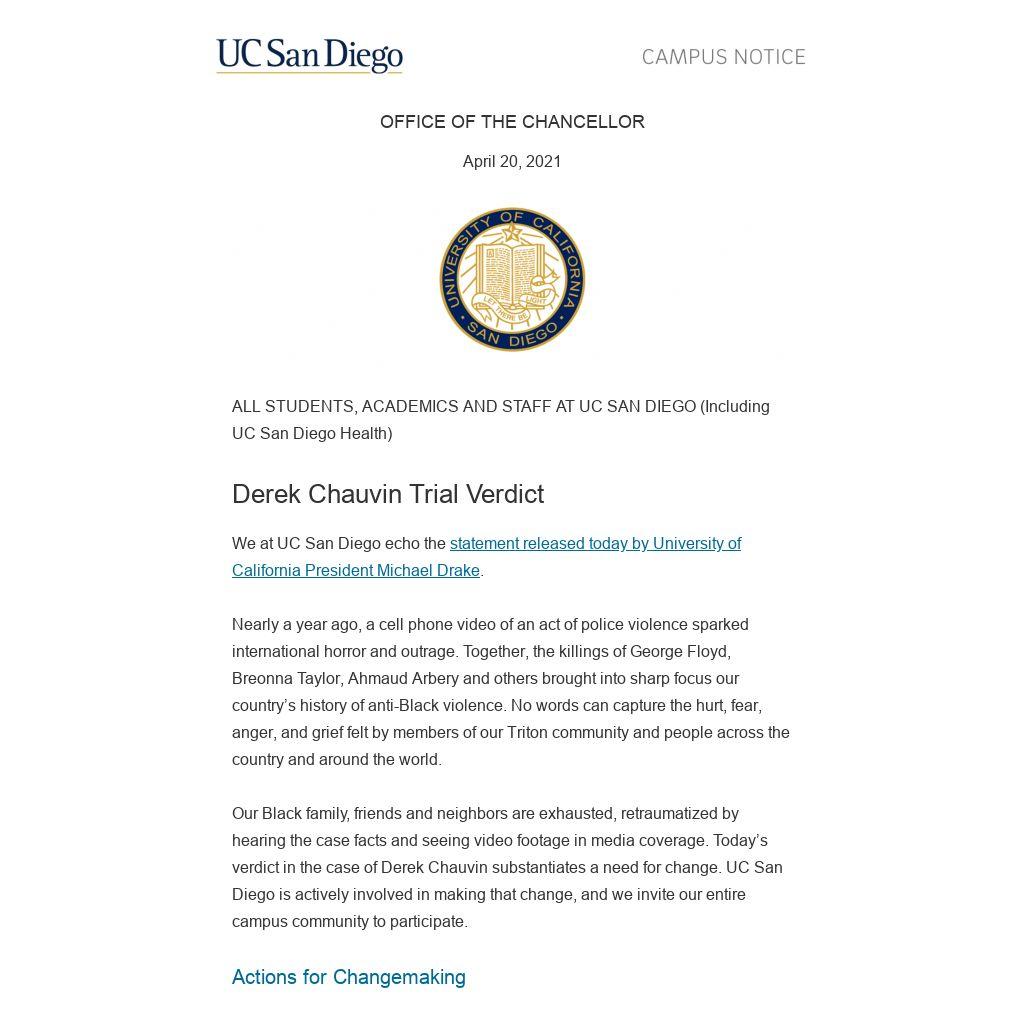 Our Black family, friends and neighbors are exhausted, retraumatized by hearing the case facts and seeing video footage in media coverage. Today’s verdict in the case of Derek Chauvin substantiates a need for change. UC San Diego is actively involved in making that change, and we invite our entire campus community to participate.