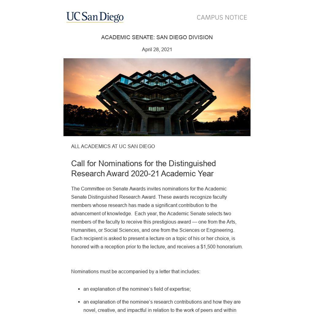 The Committee on Senate Awards invites nominations for the Academic Senate Distinguished Research Award. These awards recognize faculty members whose research has made a significant contribution to the advancement of knowledge. Each year, the Academic Senate selects two members of the faculty to receive this prestigious award — one from the Arts, Humanities, or Social Sciences, and one from the Sciences or Engineering. Each recipient is asked to present a lecture on a topic of his or her choice, is honored with a reception prior to the lecture, and receives a $1,500 honorarium.