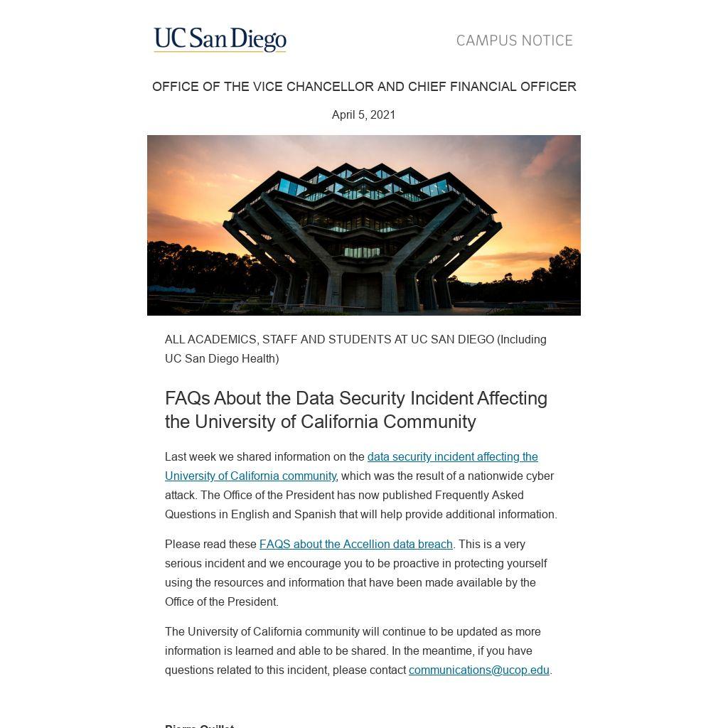 Please read these FAQS about the Accellion data breach. This is a very serious incident and we encourage you to be proactive in protecting yourself using the resources and information that have been made available by the Office of the President.