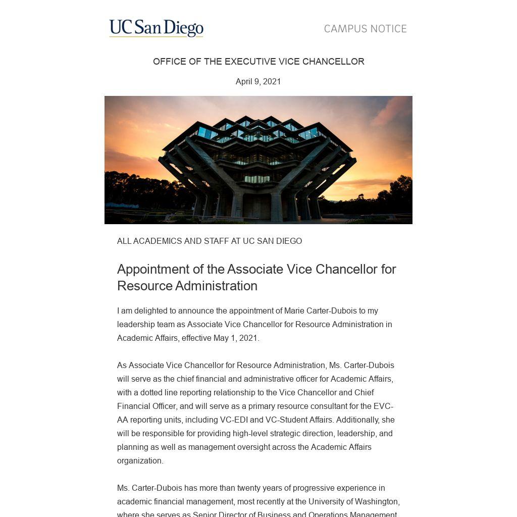 Please join me in warmly welcoming Marie Carter-Dubois to UC San Diego. Her deep understanding of the strategic, financial, and administrative challenges facing academic institutions and her creative leadership approach will serve Academic Affairs and our university well. I would like to also extend my sincere appreciation to Steve Ross for his six years of outstanding leadership and partnership as AVC-RA and thirty-five years of valued service to our university. We all wish him the very best in his impending retirement.